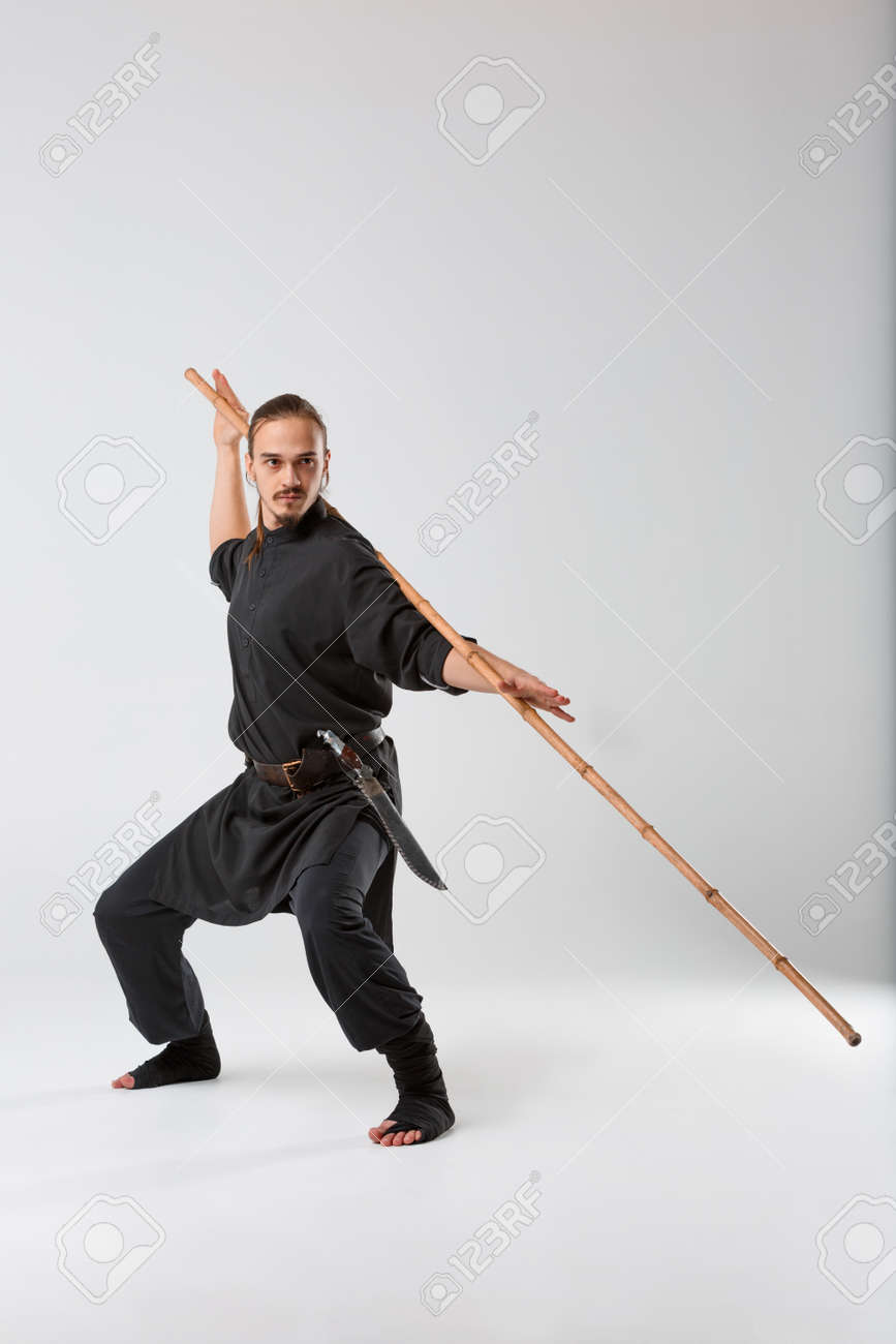 A Man In A Black Kimono Is Practicing Martial Arts Technique With A Long Bamboo Fighting Stick Stock Photo Image Of Flexibility Fighting 106320478
